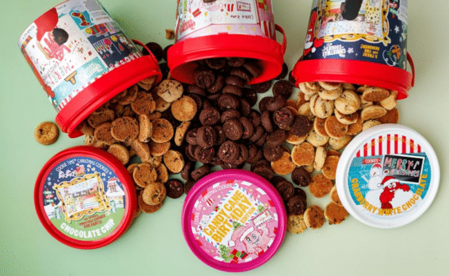 - Buckets Full of Scrumptious Bite-Size Cookies – A bucket (600 g) brimming with around 85 cookies. Buckets of happiness full to the brim with festive flavours – dive in and savour the season with friends, family and Santa too!